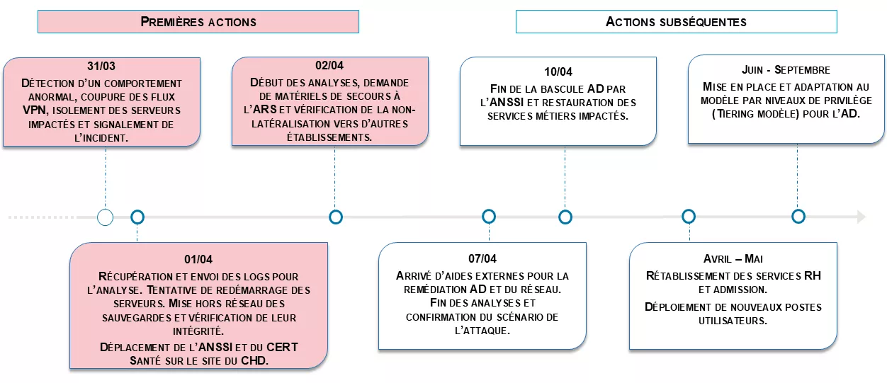 En mars 2025, le Centre Hospitalier Départemental Stell de Rueil-Malmaison a été victime d’une compromission de son système d’information, à la suite de la réactivation d’un ancien compte administrateur pour un audit, disposant d’un accès VPN et d’un mot de passe faible. Une cellule de crise réunissant l’établissement, l’ANSSI et le CERT Santé a été mise en place pour piloter la réponse à l’incident.